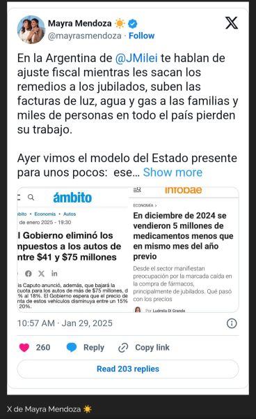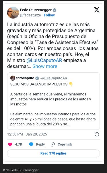 Y sumó: “Gloriosos los años en los que la mayoría tenía salarios dignos y podía comprar su primer auto, impulsando además la industria nacional. Hoy, para esas mismas personas, solo hay tarifazos, despidos y abandono”. Las declaraciones fueron acompañadas por menciones a dos noticias: la primera precisaba que el Gobierno “eliminó los impuestos a los autos de entre $41 y $75 millones” y bajó la alícuota para los que superan ese monto; la segunda indicaba que en diciembre “se vendieron 5 millones de medicamentos menos” que en el mismo mes de 2024.