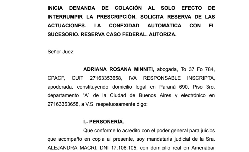 En su presentación ante el Juzgado Civil N°14, a cargo del magistrado Federico Causse, Alejandra exige que se reconozca su derecho hereditario mediante una acción de colación. Esta herramienta jurídica busca garantizar que las transmisiones patrimoniales realizadas en vida por Franco Macri sean incluidas en el acervo sucesorio.