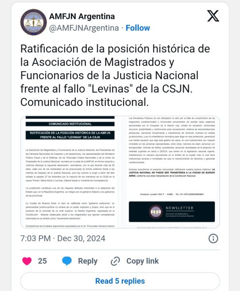 Manifestamos una vez más como esto vulnera el federalismo consagrado por nuestra Carta Magna, pretendiendo además someter las decisiones de las Cámaras Nacionales de Casación y de Apelaciones a un tribunal local: El Superior Tribunal de Justicia de la CABA”, señaló la UEJN.