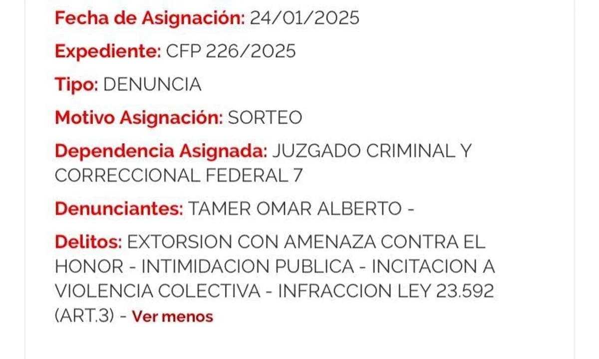 A las denuncias se le suma también la de Alberto Tamer, bajo los delitos de “extorsión con amenaza contra el honor – intimidación publica – incitación a la violencia colectiva – infracción de la ley 23.592”