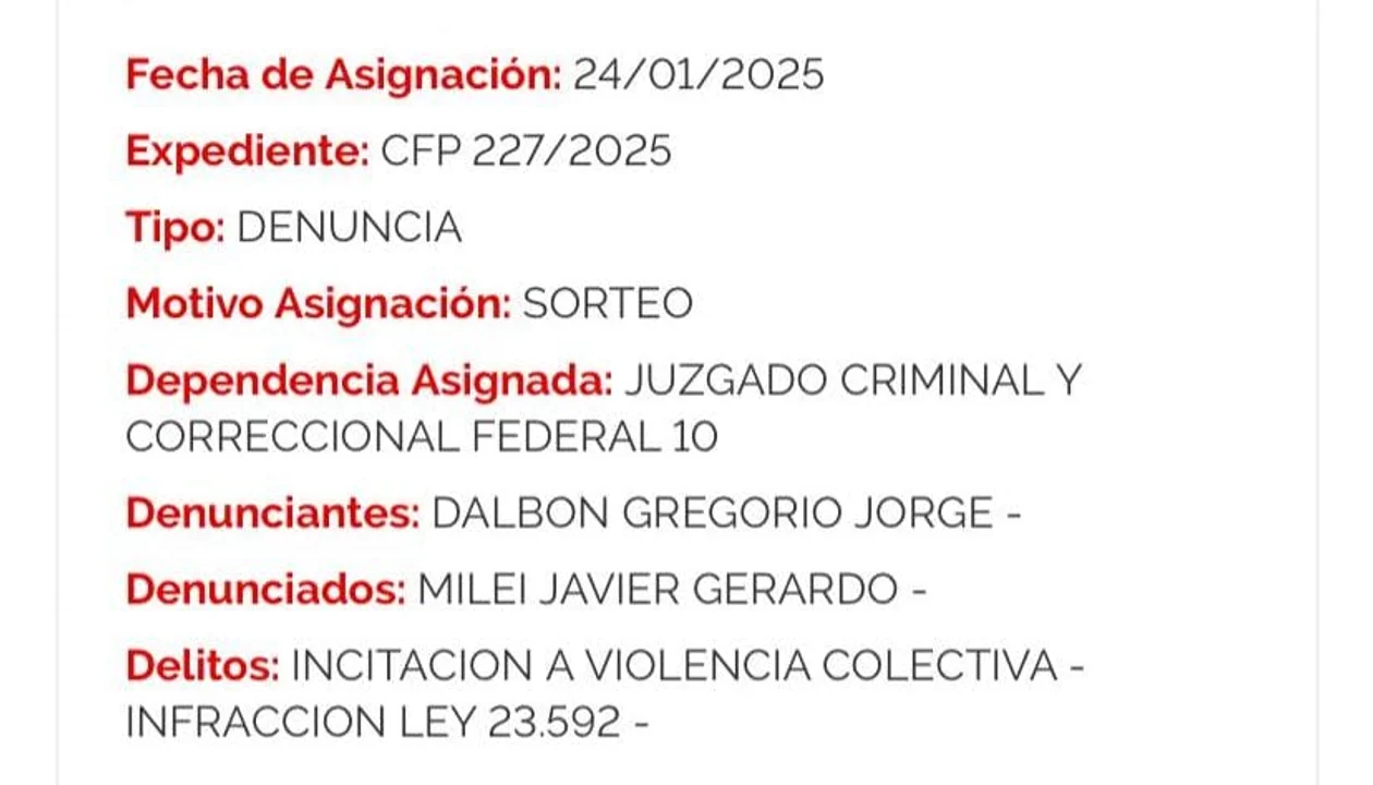 El abogado Gregorio Dalbón, conocido por su historial en causas de derechos humanos, también presentó una denuncia penal contra Milei, calificando sus dichos en Davos como una «incitación abierta a la violencia». En su presentación, pidió la habilitación de la feria judicial y la remisión del caso al Congreso para que se inicie un juicio político contra el Presidente.
