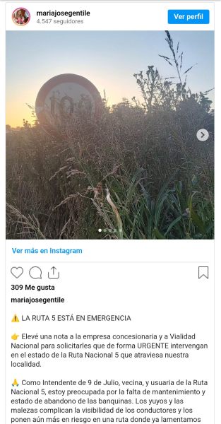 En la carta dirigida al administrador general de Vialidad Nacional, Marcelo Jorge Campoy, Gentile solicitó “de manera urgente” la intervención del organismo, ante la preocupación que genera “la falta de mantenimiento y abandono de las banquinas, cubiertas de malezas, lo que afecta la visibilidad y seguridad de quienes por allí transitan.