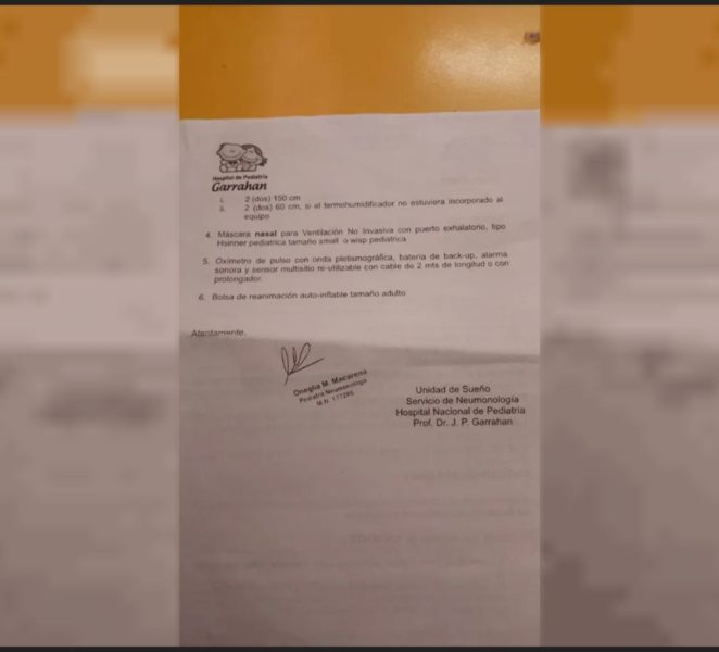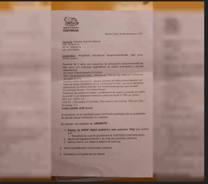 Según el pedido realizado por el Garrahan, la entrega del equipo es indispensable para garantizar la oxigenación de Fabricio durante el sueño y evitar complicaciones graves.