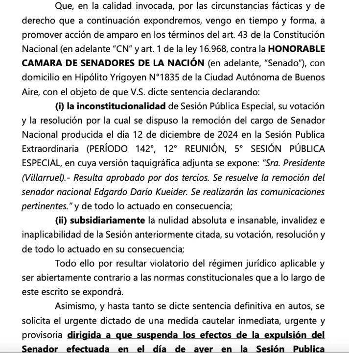 En el escrito, al que accedió Data Clave, Kueider pide una cautelar que suspenda la decisión del Senado mientras se define su planteo de ser restituido en el puesto. Considera que debe declararse inconstitucional la votación o, en su defecto, declararse la “nulidad absoluta e insanable, invalidez e inaplicabilidad de la Sesión anteriormente citada, su votación, resolución y de todo lo actuado en su consecuencia”.