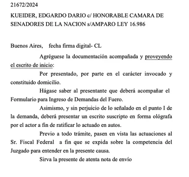 Ante esto, el juez Enrique Lavié Pico tomó las primeras medidas: ordenó que presente “un escrito suscripto en forma ológrafa por el actor a fin de ratificar lo actuado”. Esto significa que debe conseguirse la firma de Kueider, a pesar de que en la demanda se había planteado que en este momento está detenido en Paraguay.