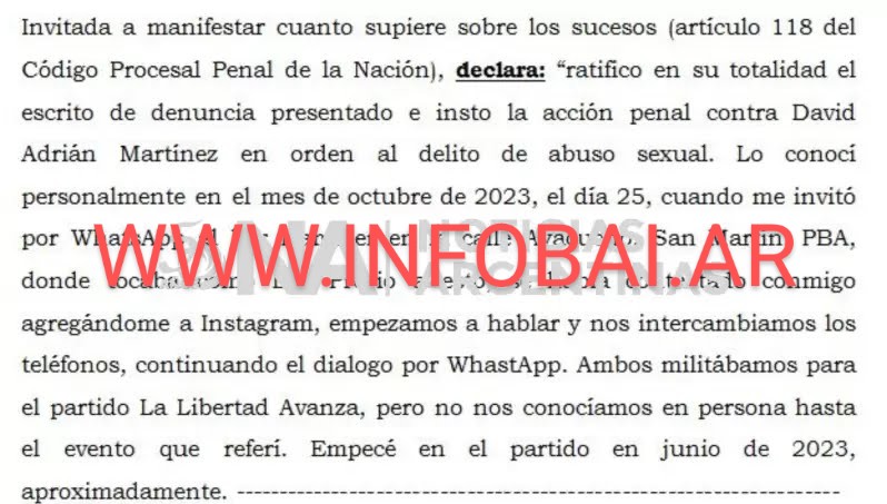 Según la denuncia a la que tuvo acceso Infoba,  M.C.A.M. conoció a Martínez en octubre de 2023 a través de redes sociales. Después de intercambiar mensajes por Instagram y WhatsApp, el músico la invitó al bar Hammer, en la localidad bonaerense de San Martín, donde tocaba como DJ. Ambos compartían militancia política en LLA.
