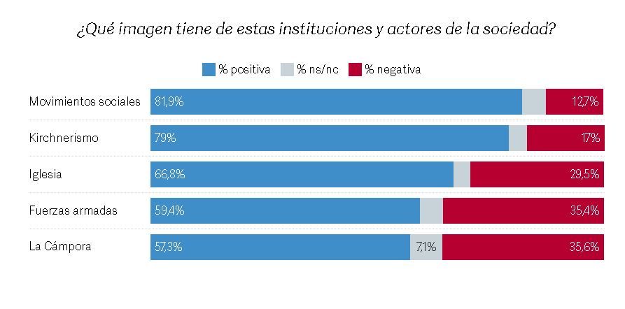 Más adelante, los encuestados con identidad peronista expresaron su opinión sobre distintas instituciones y actores sociales. Aunque todos obtuvieron balances positivos, surgieron matices interesantes: los piqueteros («movimientos sociales») recibieron una mejor valoración que «el kirchnerismo», mientras que «La Cámpora» quedó en último lugar.