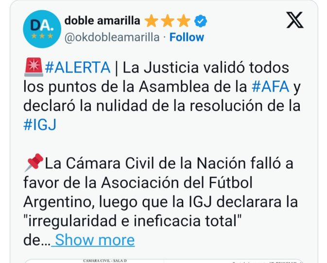 La Justicia validó todos los puntos de la Asamblea de la Asociación del Fútbol Argentino y declaró la nulidad de la resolución de la Inspección General de Justicia, luego que la IGJ declarara la «irregularidad e ineficacia total» de dicha Asamblea.