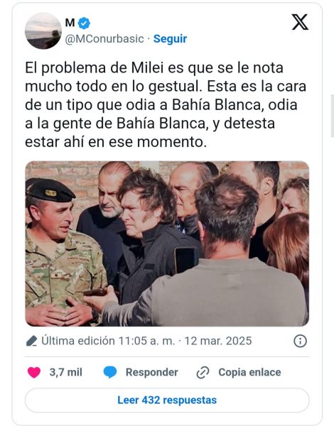 Seis días después del devastador temporal que arrasó la ciudad, el presidente Javier Milei apareció por fin en Bahía Blanca. Llegó de madrugada, sin avisar a la prensa, con la excusa de evitar “politización”. Pero los vecinos, hartos de promesas vacías y abandono, lo recibieron con gritos y reproches: “¡Caretas! ¡Vienen por la fotito!”.