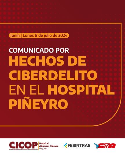 En el marco de una serie de hechos delictivos en el Hospital Piñeyro producto del robo de datos personas, desde la Asociación Sindical de Profesionales de la Salud de la Provincia de Buenos Aires (CICOP), Seccional Junín, desaconsejaron rotundamente a los trabajadores de dicho establecimiento la entrega de datos biométricos, solicitados recientemente por la Dirección para el fichaje a través de la huella dactilar.
