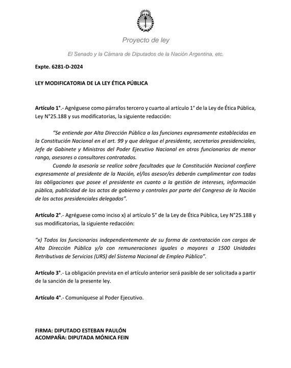 Mónica Fein por su parte, manifestó que la propuesta busca regular y transparentar el accionar de la Alta Dirección Pública (ADP) porque “la Oficina Anticorrupción continúa sin modificar la interpretación legal y es fundamental que estos asesores presenten una declaración jurada obligatoria, independientemente de si su cargo es remunerado o no». En ese sentido, agregó: «No podemos aceptar que personas con semejante responsabilidad no rindan cuentas sobre su patrimonio antes, durante y después de su función pública”.