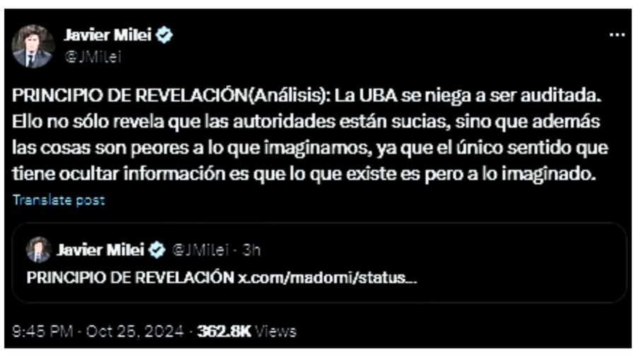 El presidente de Argentina, Javier Milei, acusó a la Universidad de Buenos Aires (UBA) de negarse a ser auditada después de que la institución iniciara acciones legales para evitar una auditoría de sus finanzas. Milei afirmó que la negativa de la UBA a ser auditada implica que las autoridades universitarias están ocultando algo y que «las cosas son peores de lo que imaginamos».