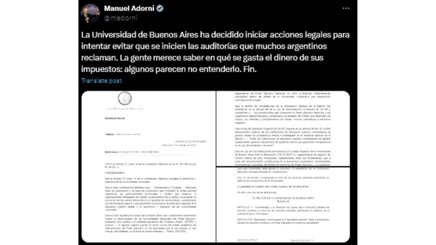 El conflicto entre el Gobierno y las universidades nacionales de Argentina por el presupuesto y auditorías llevó a la Universidad de Buenos Aires a presentar acciones judiciales para proteger su autonomía. El Rectorado de la UBA destacó que ya tienen mecanismos de auditoría interna y externa, realizadas por la Auditoría General de la Nación.