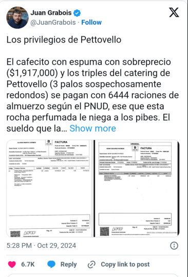 “El cafecito con espuma con sobreprecio ($1,917,000) y los triples del catering de Pettovello (3 palos sospechosamente redondos) se pagan con 6444 raciones de almuerzo según el PNUD, ese que esta rocha perfumada le niega a los pibes. El sueldo que la desnutridora cobra para dar charlas de nutrición (4 palos) vale por otras 5254 raciones”, apuntó por su parte Juan Grabois