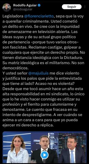 Las palabras de la legisladora se hicieron virales en redes sociales y rápidamente Aguiar le advirtió a través de X (ex Twitter) que la denunciaría por cometer un delito en vivo: «Legisladora @florenciarietto, sepa que la voy a querellar criminalmente. Usted cometió un delito en vivo. Se cree con la impunidad de amenazarme en televisión abierta. Las ideas suyas y de su actual grupo político de pertenencia -porque tuvo varios otros- son fascistas. Reclaman castigar, golpear a cualquiera que ejercite un derecho propio. No tienen distancia ideológica con la Dictadura. Su matriz ideológica es el militarismo. No son democráticos».