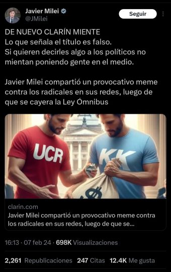«El 85% de los medios mienten»: Este latiguillo ya se ha convertido en una de sus frases de cabecera. Durante su campaña electoral, Milei sostuvo que casi todos los medios “tergiversan los hechos para confundir a la población”. Aunque no es el primero ni será el último presidente en enfrentarse a la prensa, su estilo es particular: no solo se limita a cuestionar las publicaciones, sino que busca “desenmascarar” a los periodistas que, según él, forman parte de una maquinaria de noticias falsas.