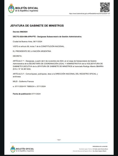 Será subsecretario de Gestión Administrativa de la Secretaría de Coordinación Legal y Administrativa de la vicejefatura de Gabinete, que funciona bajo la órbita de Guillermo Francos.