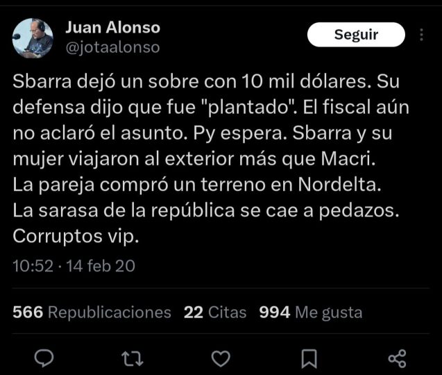Sbarra intentó defenderse de las acusaciones difundiendo la versión de que el sobre había sido “plantado” por las nuevas autoridades nacionales. Sin embargo, esa teoría quedó desestimada tras dos declaraciones clave: una exsecretaria de Sbarra confirmó que la letra manuscrita en el sobre era suya, y la empleada de Nordelta afirmó que el hombre había adquirido un lote valuado en 180.000 dólares.