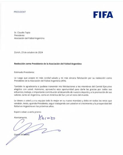 En una misiva, el presidente de FIFA saludó a Tapia y al flamante Comité Ejecutivo y le agradeció por «todos sus esfuerzos، trabajo, e importante contribución al desarrollo de nuestro deporte y a la promoción de sus valores, tanto en Argentina, como en América del Sur y en el resto del mundo».